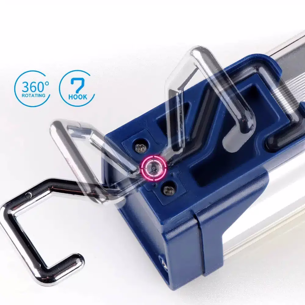 Le corps de la lampe baladeuse LithStick est conçu dans un alliage d’aluminium, recouvert de plastique ABS. Ces matières lui confèrent une solidité et une prise en main très confortable. Mais notre baladeuse LED possède également quelques appendices qui vous permettront de l’utiliser en gardant les mains-libres. En effet, elle dispose d’un aimant pas plus gros qu’une pièce, mais très puissant. Vous pourrez donc fixer la baladeuse à des surfaces métalliques telles que les carrosseries de voitures pour vous éclairer. De plus, un crochet de suspension situé au bout de la lampe, permet de l’accrocher à d’autres supports qui ne peuvent pas être absorbés. Autrement dit, notre lampe rechargeable baladeuse LithStick s’adaptera à divers environnements, même les plus difficiles.