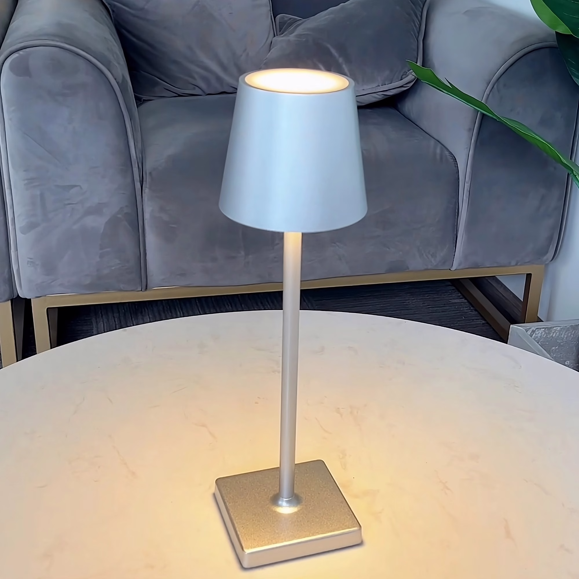 Une lampe de table LED argent Gloria simple et polyvalente