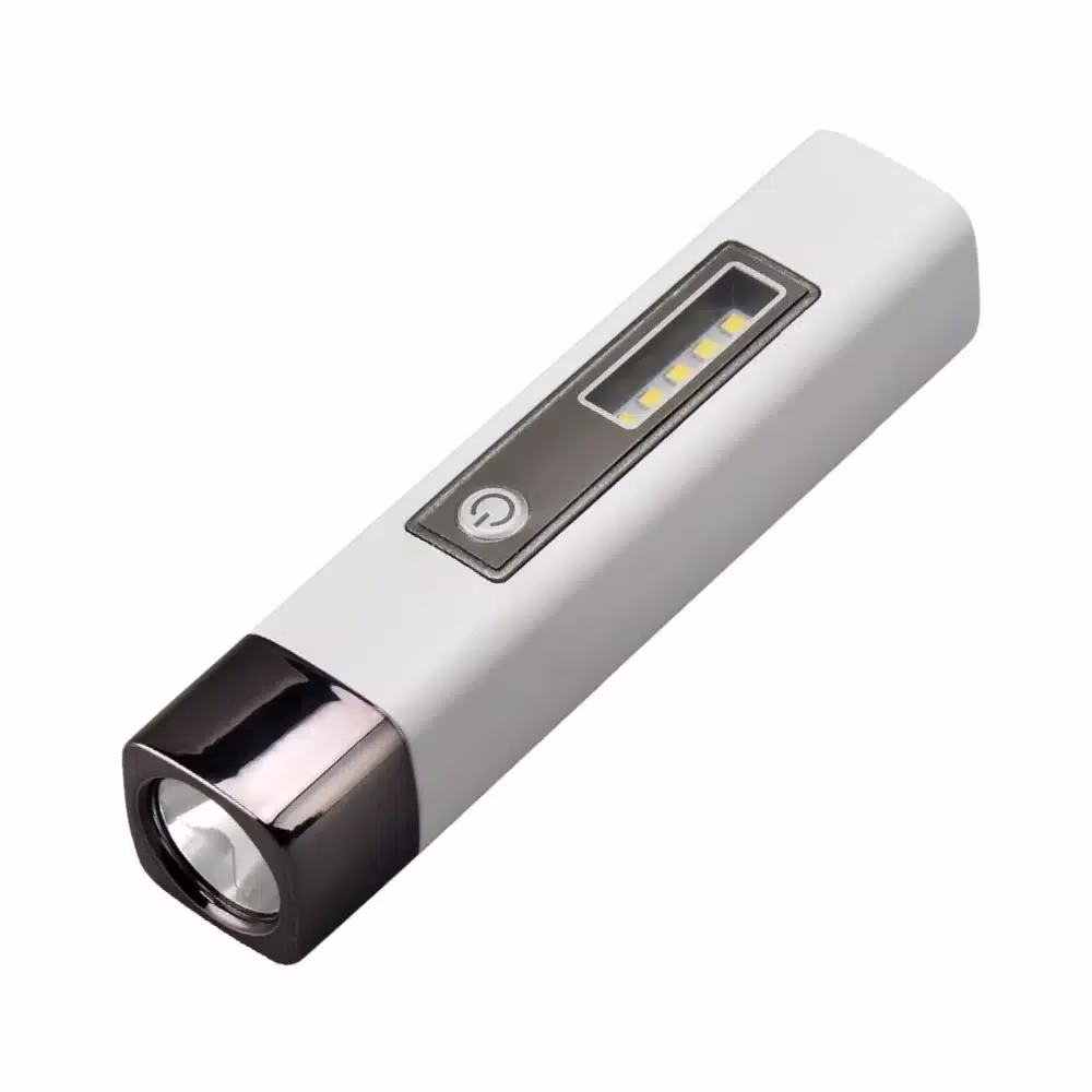 Venez découvrir cette lampe de poche rechargeable grise PowerBank avec son design compact mais qui aura plus que de la lumière à vous donner.