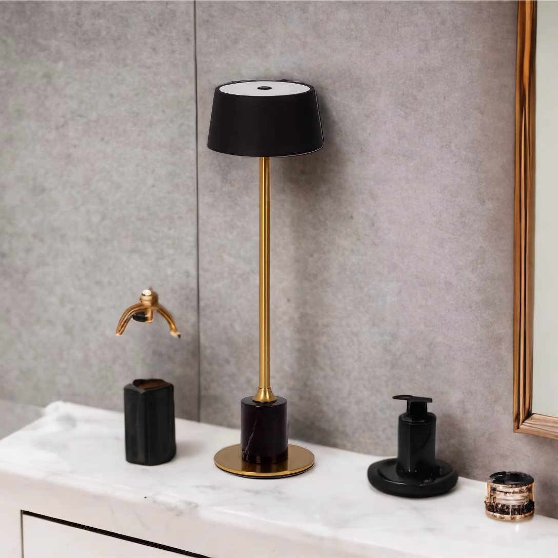 Si vous recherchez une pièce de décoration lumineuse et luxuriante, vous ne devriez pas passe à côté de notre lampe de table LED sans fil rechargeable Nevra. Celle-ci possède certes, une forme simple. En effet, son abat-jour conique repose sur le corps de la lampe en acier inoxydable. Mais sa finition dorée et son pieds marbré font toute la différence. Ils lui offre en effet, un aspect des plus élégant avec une grande finesse. Par ailleurs, celui-ci n’en aura que plus d’éclat grâce à la lumière douce que produit la lampe de table Nevra. Que ce soit pour la table d’un restaurant ou votre propre table à manger, notre lampe à poser s’y retrouvera l’instant d’un diner convivial avec une touche de sophistication.