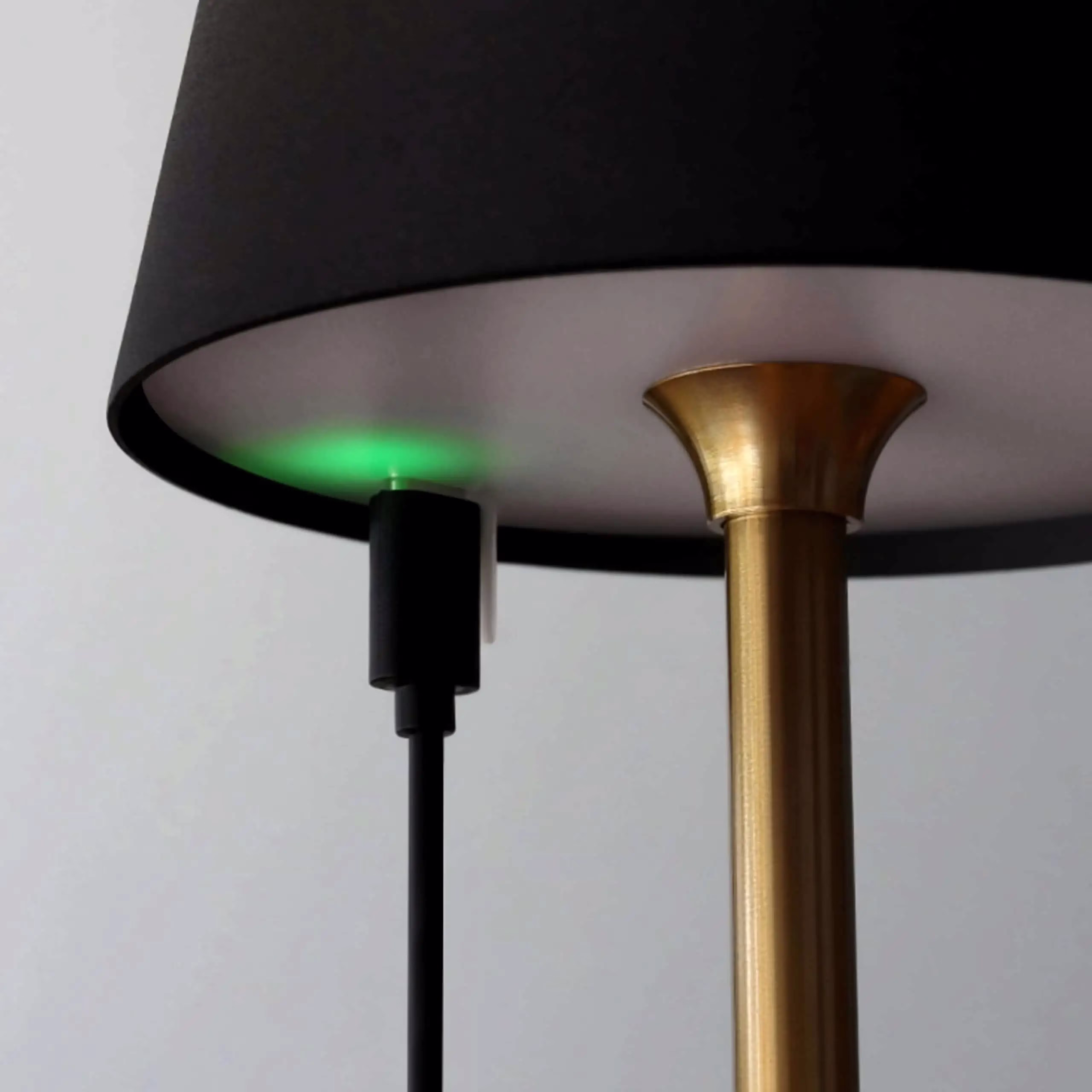 Voici pour vous notre lampe de table LED sans fil rechargeable Nevra très élégante avec son abat-jour conique noire suspendue au dessus de son corps doré.