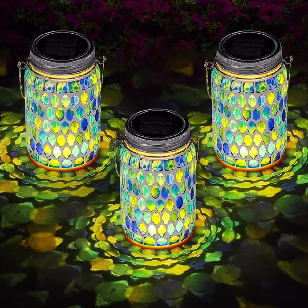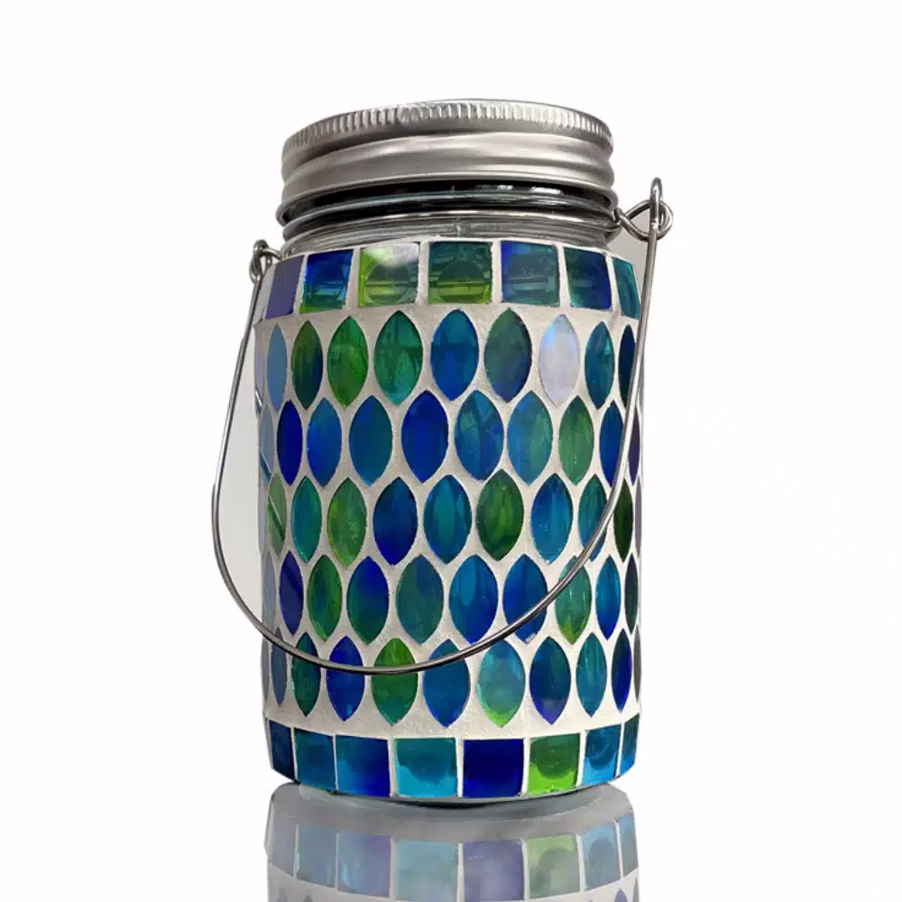 Venez admirer notre lanterne solaire à suspendre mosaïque bleue pour décorer votre jardin d’une lampe mosaïque qui se laisse traverser par la lumière