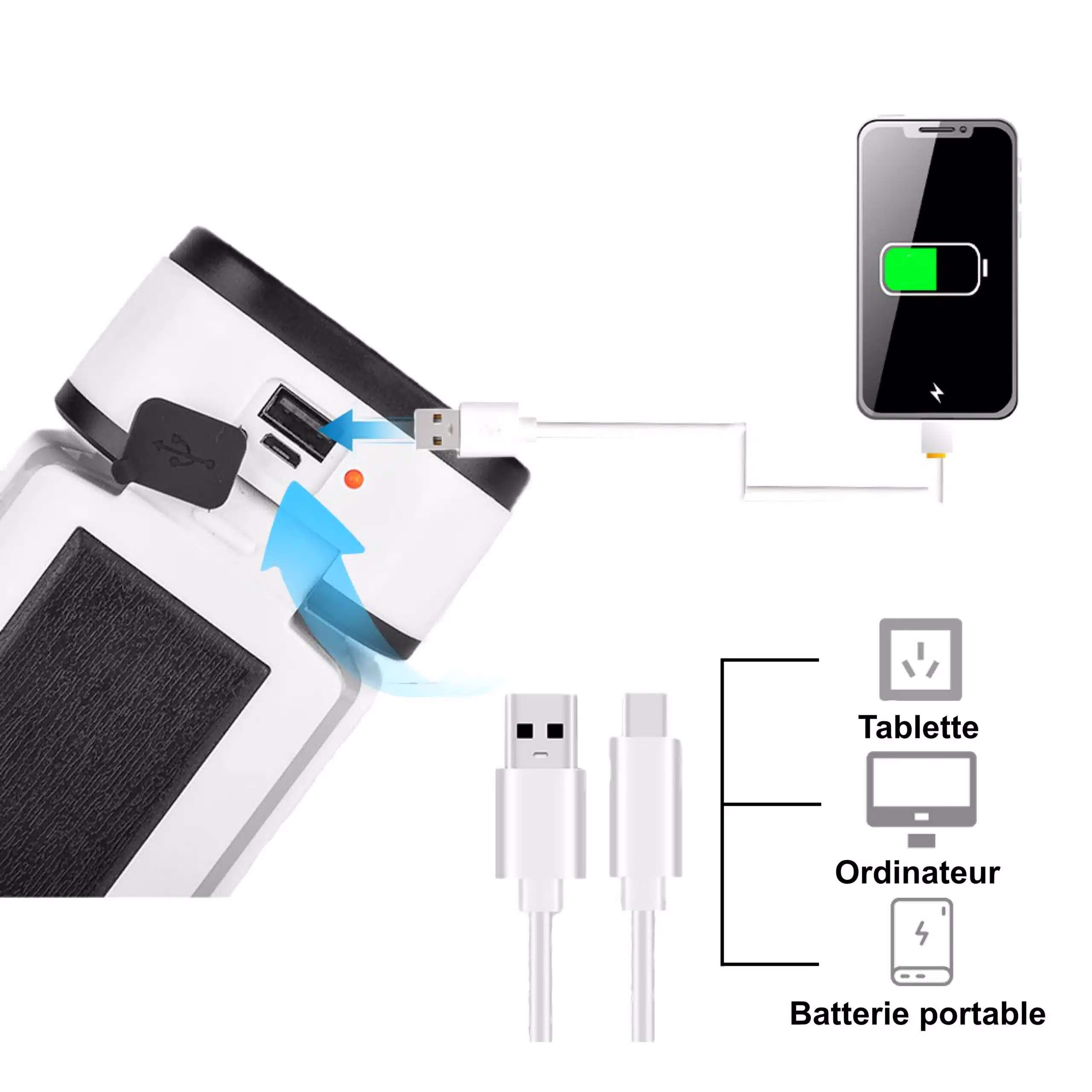 La lampe Tripod peut-être rechargée de deux manières différentes. La première, c’est de la brancher avec son câble USB sur un chargeur secteur ou un appareil disposant aussi d’une prise USB. La seconde et pas des moindres, c’est grâce à l’énergie solaire. He oui, la lampe rechargeable Tripod dispose d’un petit panneau solaire qui lui permet de transformer la lumière du soleil en énergie. De plus, lorsque les journées seront bien éclairées, vous pourrez en profiter pour économiser l’énergie qui a été accumulée lors de la charge USB. Sans compter que celle-ci doit durer environ 3 h 30 pour être complète. Donc la lampe rechargeable LED camping Tripod pourra avoir une super autonomie, super extensible et pourra vous éclairer pendant plusieurs jours d’affilé.
