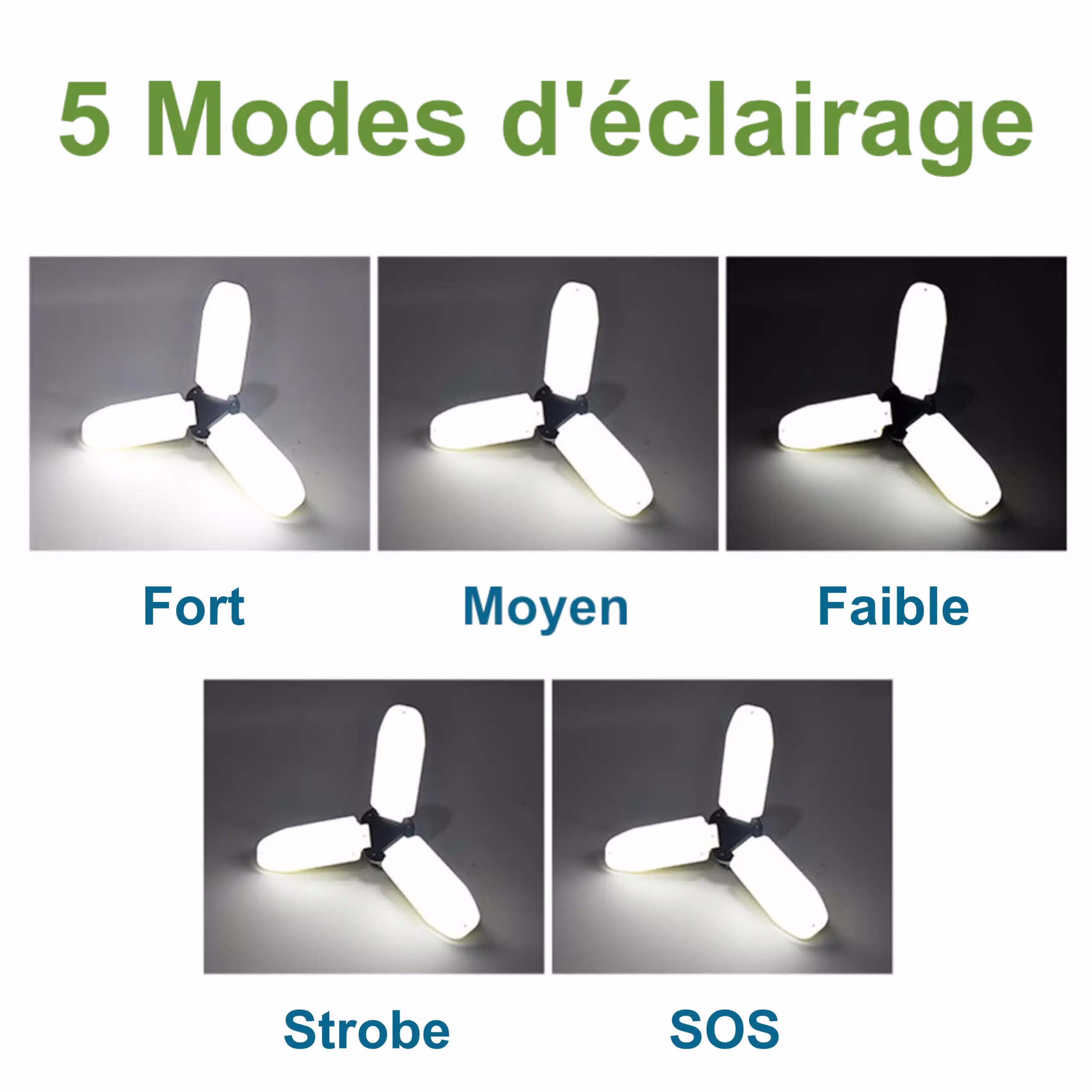 La lanterne rechargeable de camping Tripod est équipée de 60 ampoules LED 5730 SMD. Elles sont réparties sur trois bras rétractables à 90°. Leur ouverture permet à la lampe Tripod de générer un flux lumineux très large. Celui-ci peut atteindre une puissance lumineuse de 1500 Lumens avec son intensité la plus élevée. Lorsque lorsque le jour se lèvera sur vous et que vous n’aurait plus besoin de la lumière de la lampe, vous pourrez rétracter ses bras pour la ranger facilement.