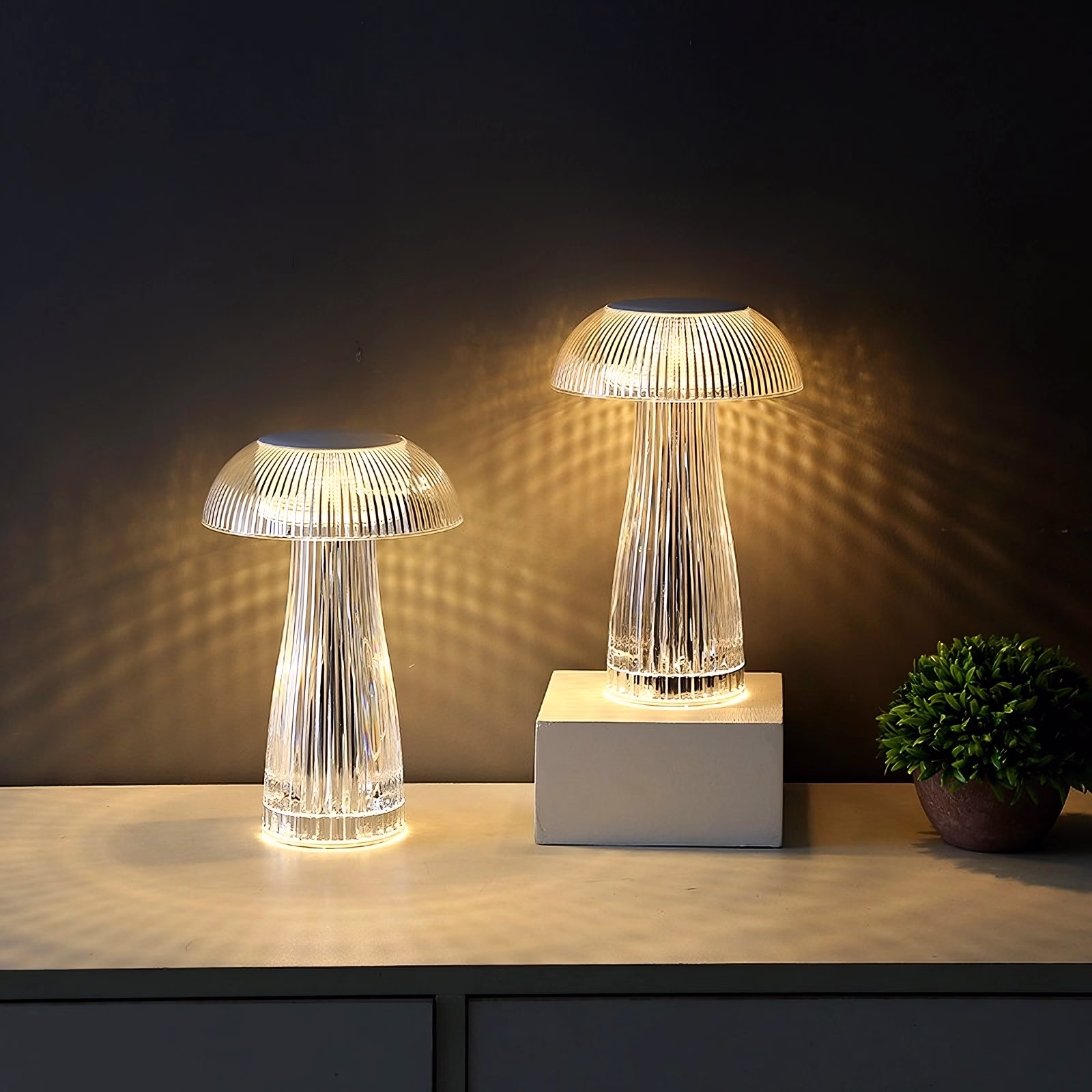 La lampe LED rechargeable sans fil Chipona est bien plus qu’une simple lampe. Son design unique en forme de champignon en fait une véritable œuvre d’art. Le corps de la lampe et l’abat-jour ne font qu’un en une seule pièce d’acrylique, créant ainsi l’illusion d’un diamant étincelant. Lorsque vous l’allumez, la lumière LED traverse majestueusement tout le corps de la lampe pour créer une ambiance enchanteresse.