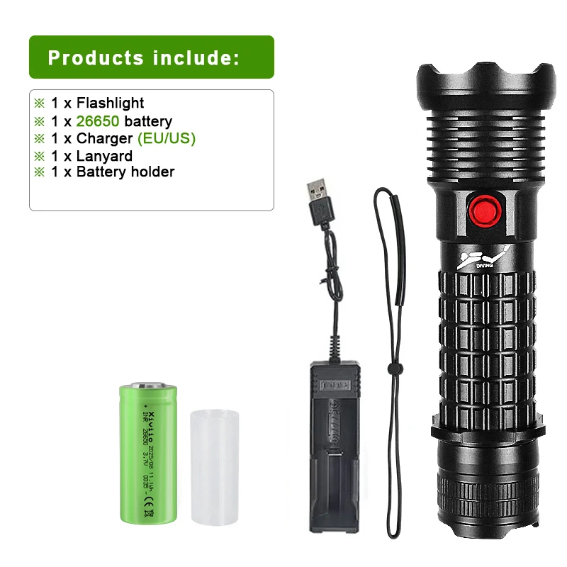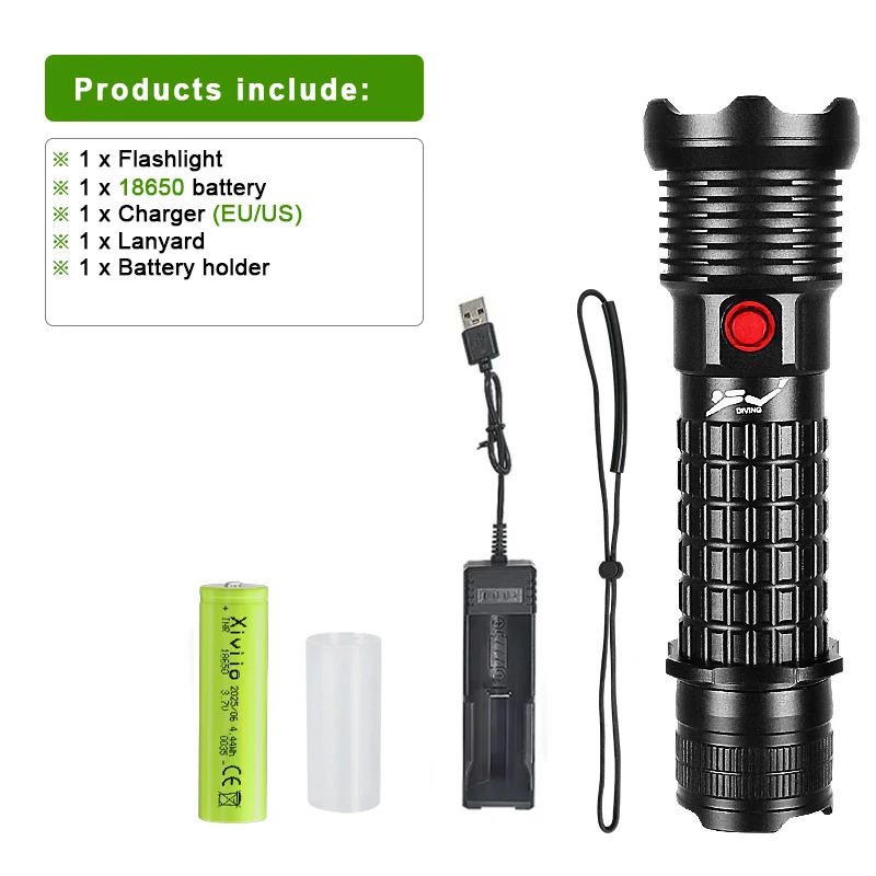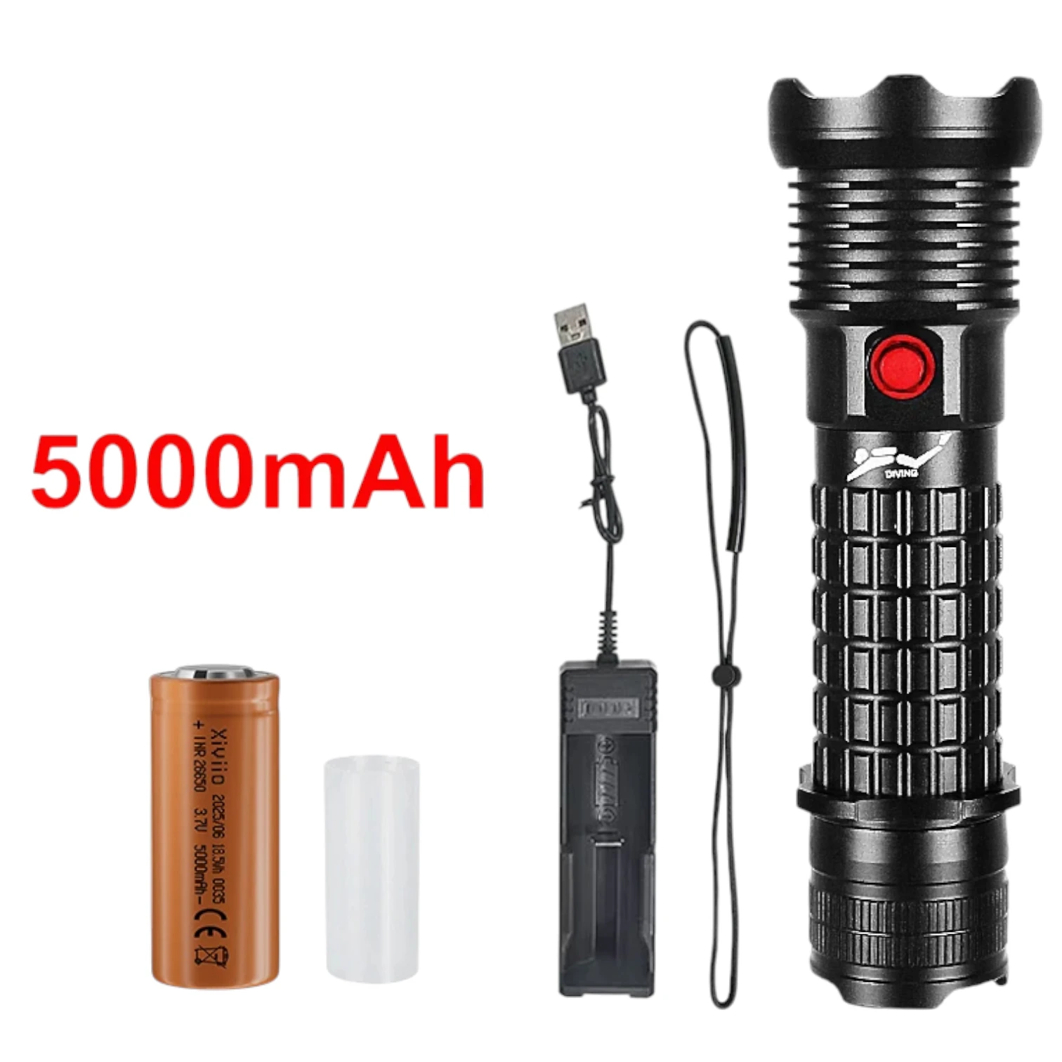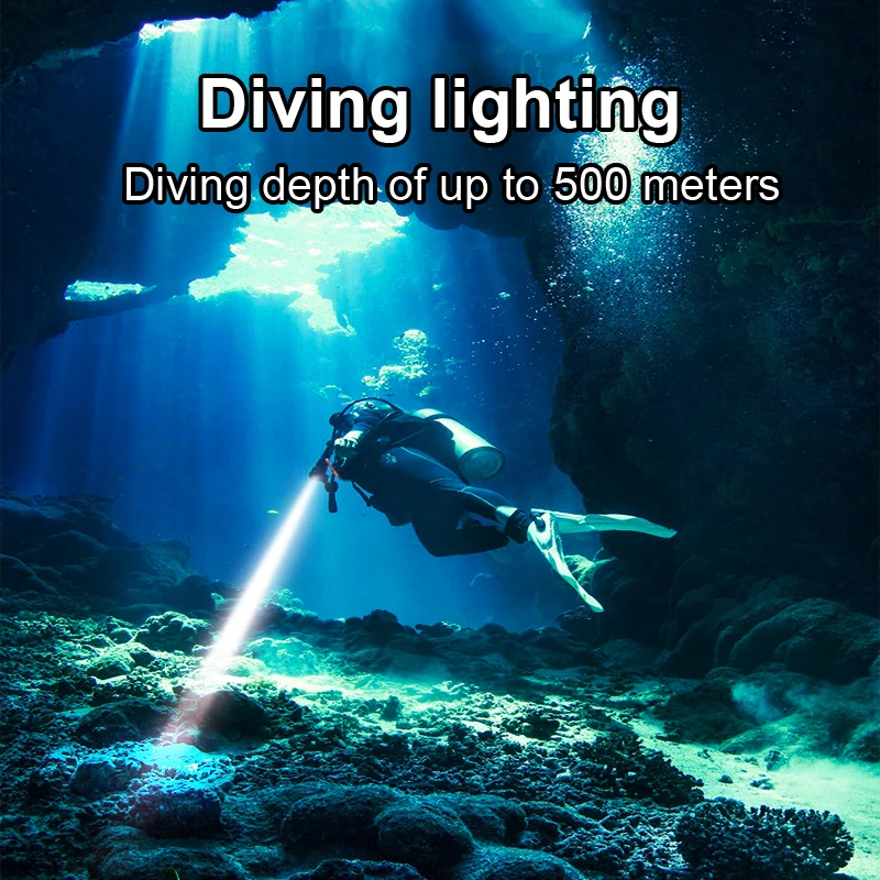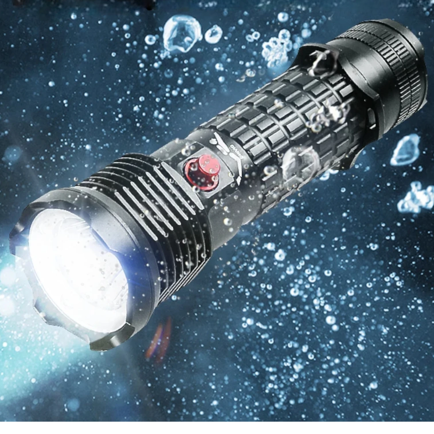 Explorez les fonds marins jusqu’à 500m avec la lampe de poche plongée XHP199 400000LM étanche IPX8. Batterie 5000mAh, faisceau ultra-puissant longue portée.