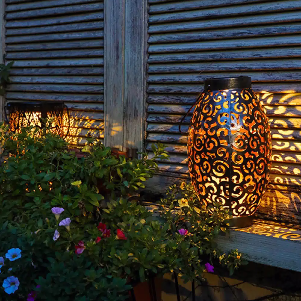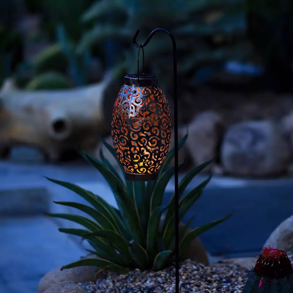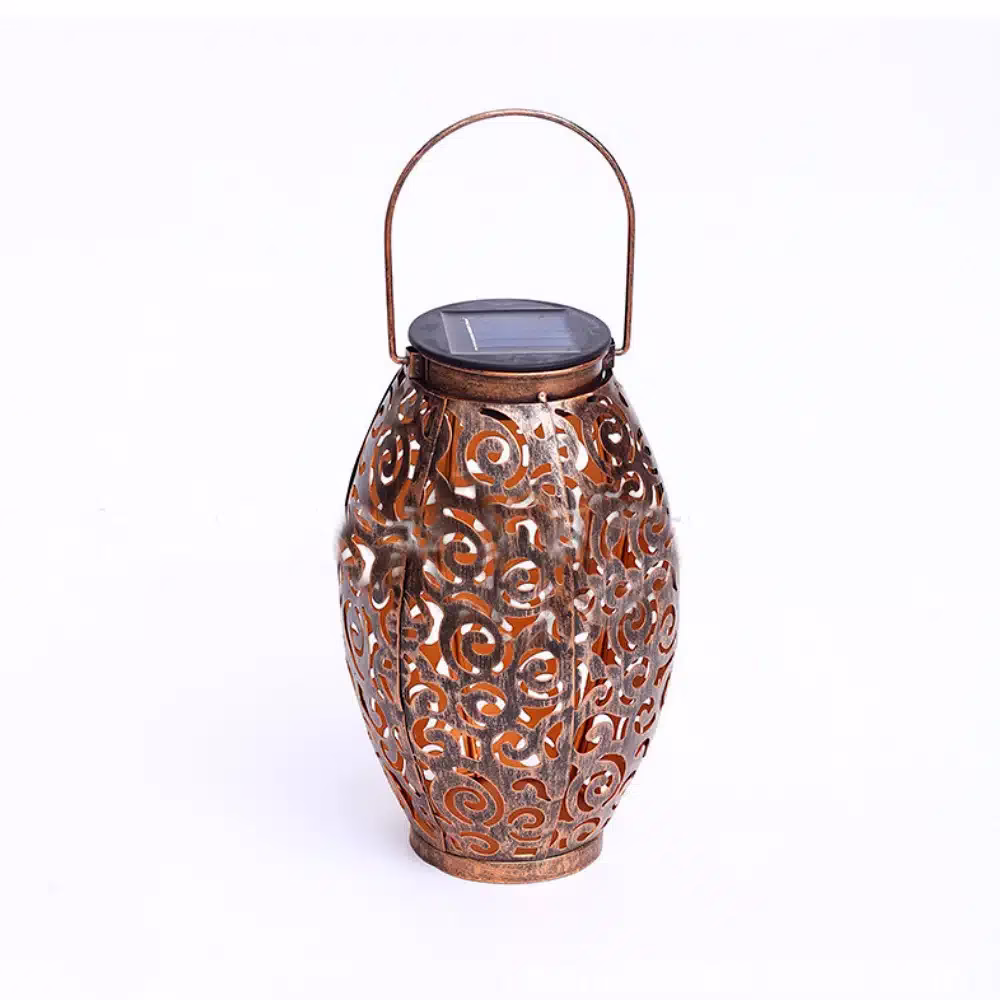 Venez découvrir notre lampe solaire décorative LED Krina avec son corps tout en métal, sa finition cuivrée et ses motifs lumineux en forme de spirale.