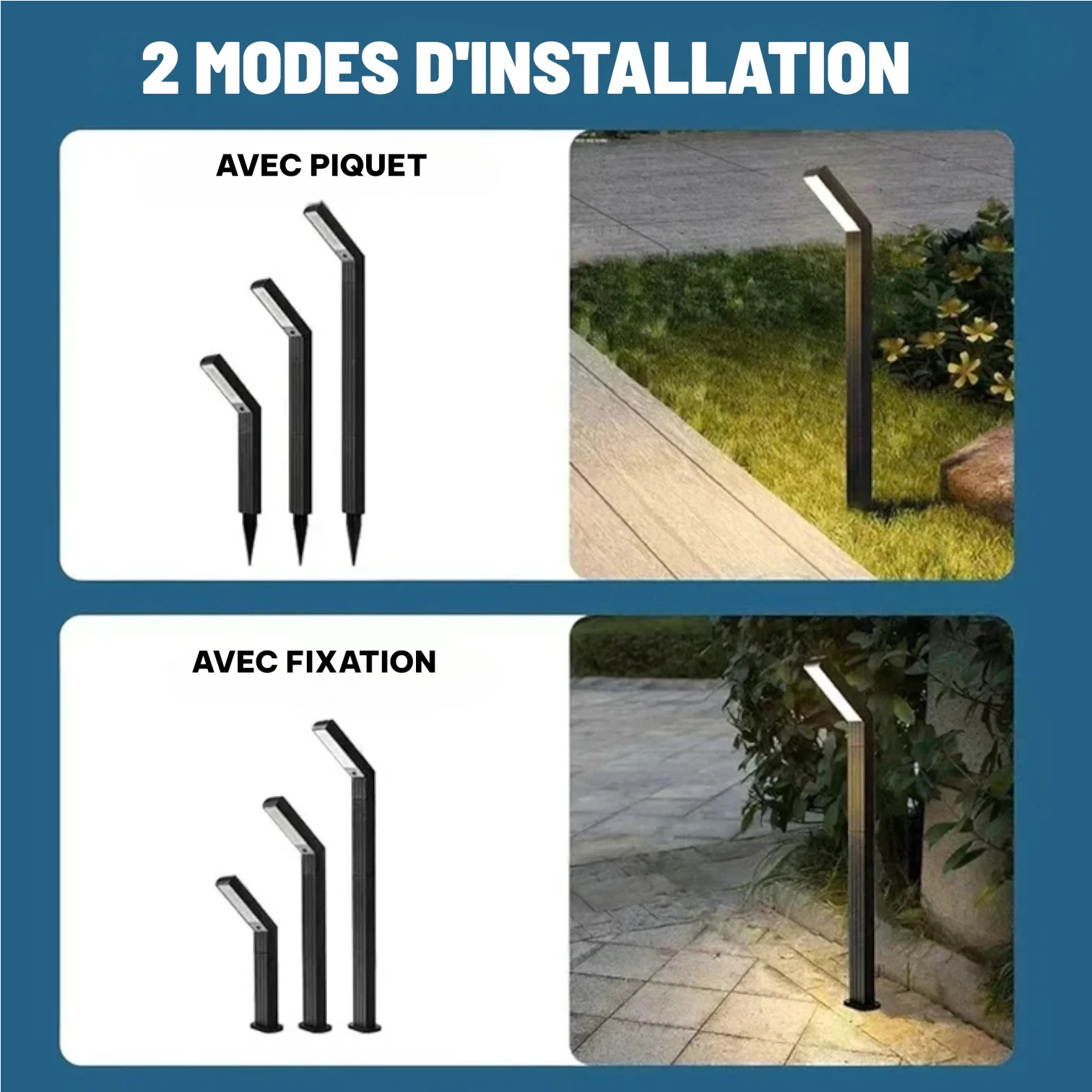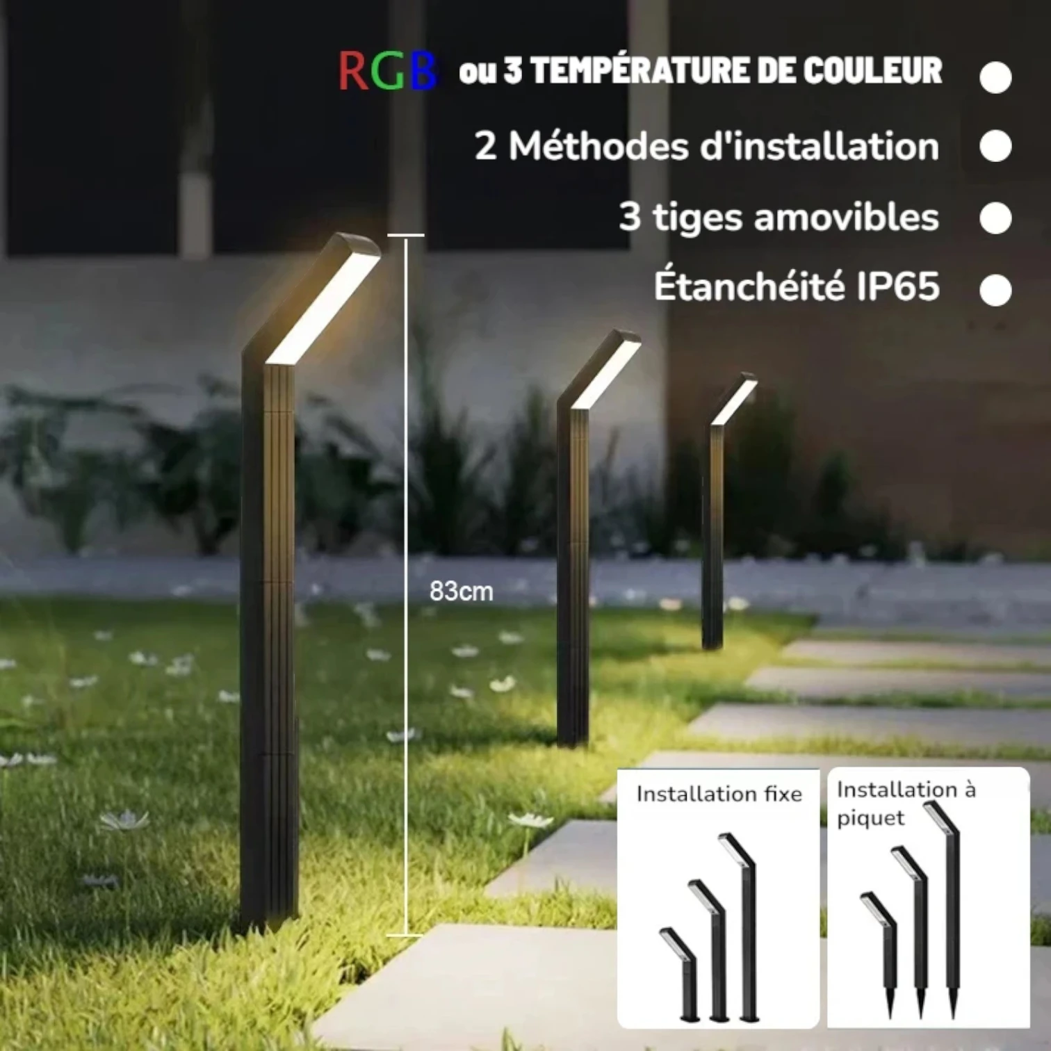 La borne lumineuse solaire s’adapte à tous vos besoins d’éclairage grâce à ses deux modes d’installation : plantation directe dans le sol avec piquets fournis ou fixation murale avec kit de visserie inclus. Sa structure modulaire composée de 3 sections amovibles permet d’ajuster la hauteur selon vos préférences esthétiques et fonctionnelles. Parfaite pour illuminer allées, bordures de pelouse, massifs floraux, terrasses ou entrées de propriété, elle convient aussi bien aux jardins privés qu’aux espaces publics. L’installation sans câblage ni branchement électrique simplifie considérablement la mise en œuvre sur tout type de terrain.