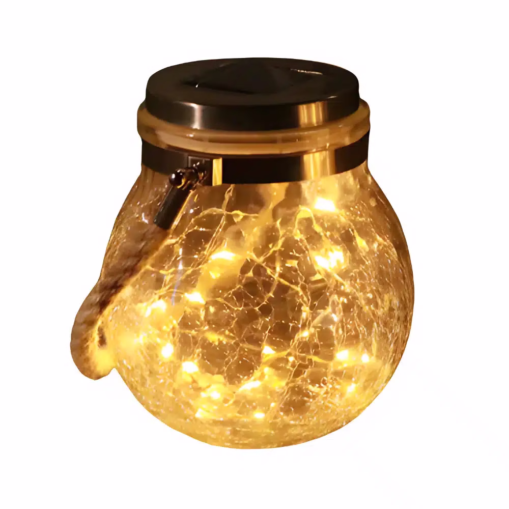 Découvrez notre lampe solaire suspendue boule verre que vous pourrez accrocher au-dessus d’une véranda ou le long d’un patio par exemple. Le corps de la lampe en forme de boule a une finition en verre d’aspect fissuré. Il contient 30 petites ampoules LED placées sur une petite guirlande en cuivre. Cette combinaison donne à cette lampe solaire tout son charme lorsqu’elle émet sa lumière. Contrairement à une disposition centrale classique, celle-ci la rend plus agréable et chaleureuse avec une diffusion plus évasée de la lumière. Cette lampe conviendra parfaitement comme luminaire de décoration au quotidien, sans forcément qu’il y ait un évènement particulier. La suspension se fera à l’aide d’un cordon en lin très rétro qui apporte du cachet à cette petite lanterne suspendue.
