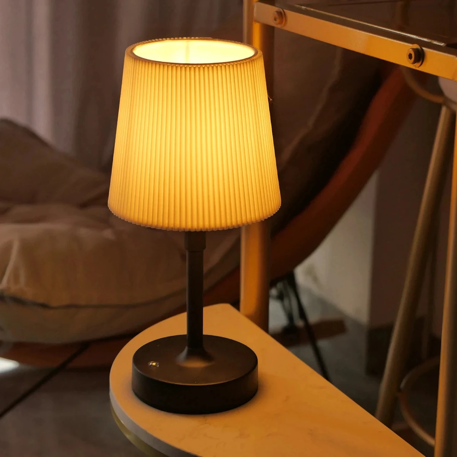 Cette lampe de table s’adapte parfaitement aux environnements multiples : chambre, salon, bureau, restaurant ou camping. Sa hauteur réglable de 30 à 39 cm permet un positionnement optimal selon chaque usage. L’abat-jour en tissu plissé diffuse une lumière douce sans éblouissement, parfaite pour la lecture nocturne. Le design compact facilite le transport lors de vos déplacements en extérieur. Les finitions métalliques de qualité et l’éclairage LED créent une atmosphère sophistiquée dans tous les espaces de vie. L’absence de câble d’alimentation garantit une liberté de placement totale.