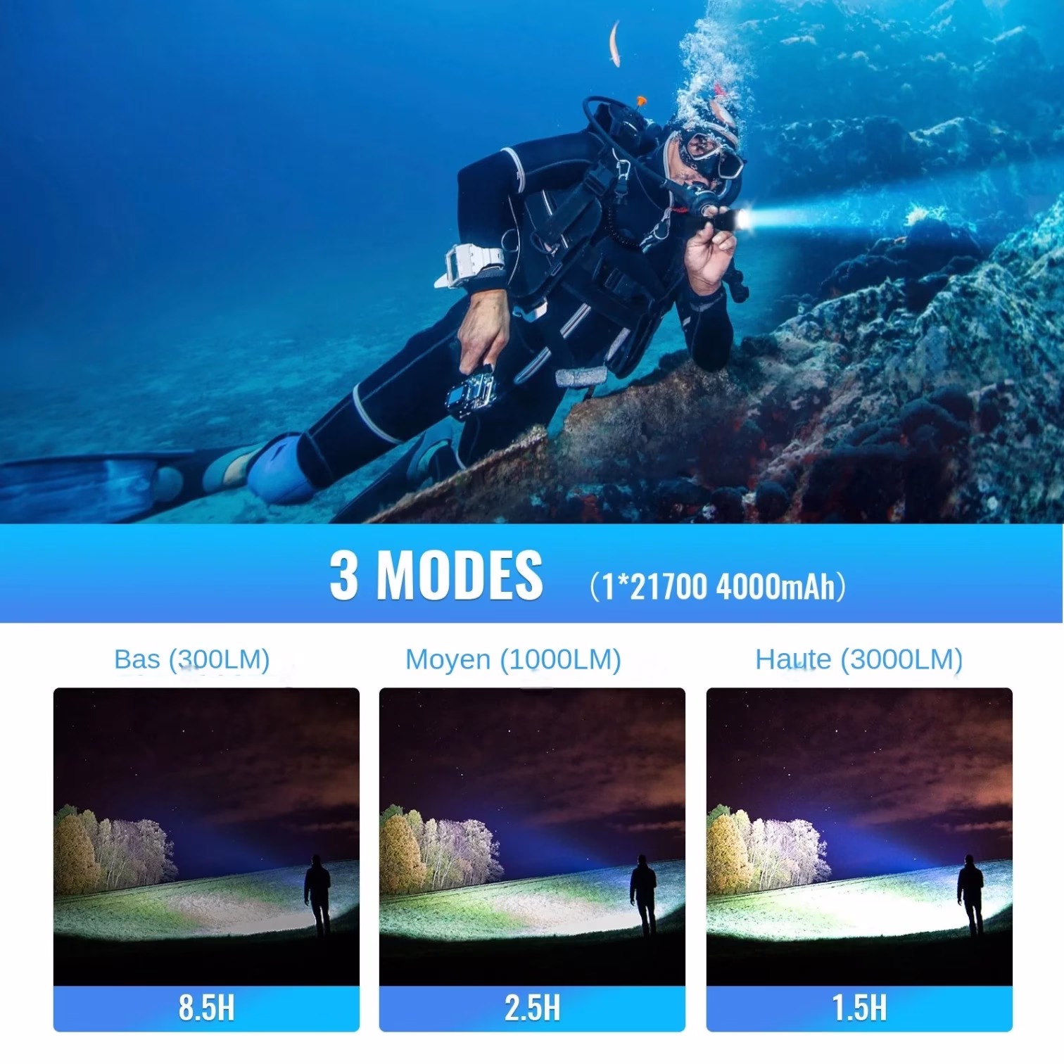 Alimentée par une batterie 21700 de 4000mAh, chaque lampe torche offre jusqu’à 8,5 heures d’autonomie en mode bas pour les plongées de longue durée. Vos explorations nocturnes ou en eaux profondes bénéficient de trois modes d’éclairage parfaitement adaptés : 300LM pour l’observation rapprochée, 1000LM pour l’exploration générale et 3000LM pour la recherche longue distance. De plus, le système de protection intelligent prévient la surchauffe et la décharge excessive pour préserver votre sécurité. Ainsi, le mode stroboscope intégré devient votre signal de détresse d’urgence en cas de problème sous l’eau.