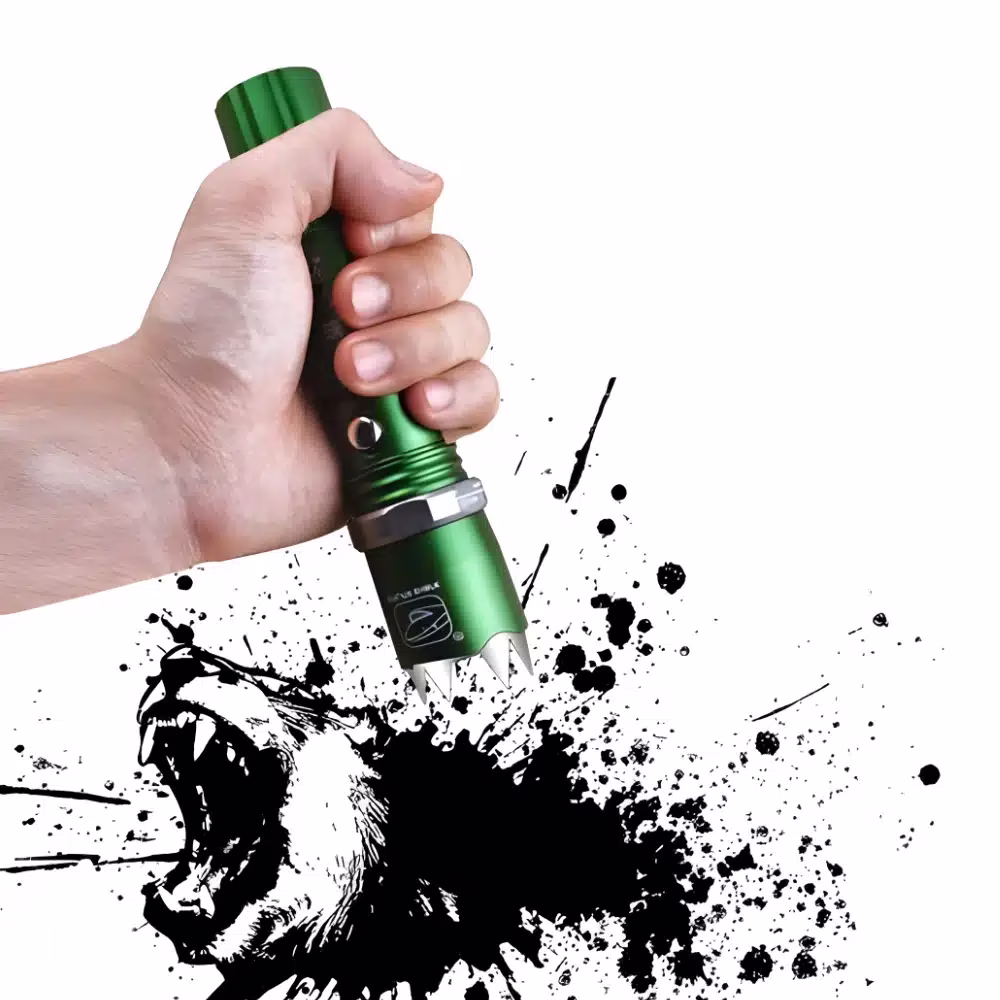 Découvrez notre lampe tactique rechargeable self-defense verte Hooked avec sa tête de lampe rétractables laissant sortir ses piques pour se défendre en cas de besoin en plus de son flux lumineux