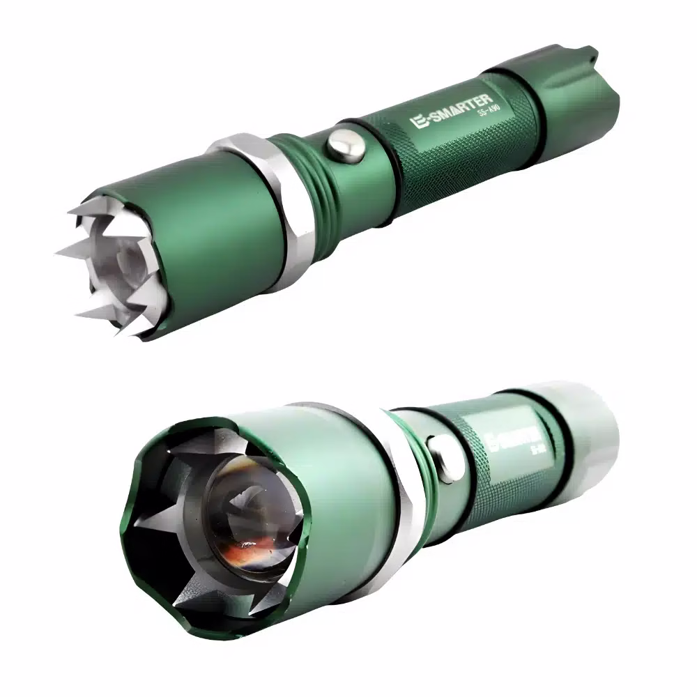 Difficile pour elle de ne pas passer inaperçue ! Notre lampe tactique rechargeable self-defense verte Hooked fera plus que produire une source lumineuse. En effet, sa tête de lampe possède un contour crénelé acéré comme des piques. Il faudra donc la manier avec précaution. Mais heureusement, il ne sera possible de les rendre accessibles qu’en rétractant la tête de lampe. D’ailleurs, même celle-ci a un côté certes très esthétique, cette particularité pourrait la transformer en arme d’auto-défense dangereuse. C’est pourquoi, vous ne devrez vous en servir qu’en cas de situation extrême si votre vie est menacée. Autrement, vous pourriez très bien utiliser cette lampe tactique pointue comme un brise-glace. Quoiqu’il en soit, elle sera là pour vous aider à vous sortir de ces quelques situations difficiles.
