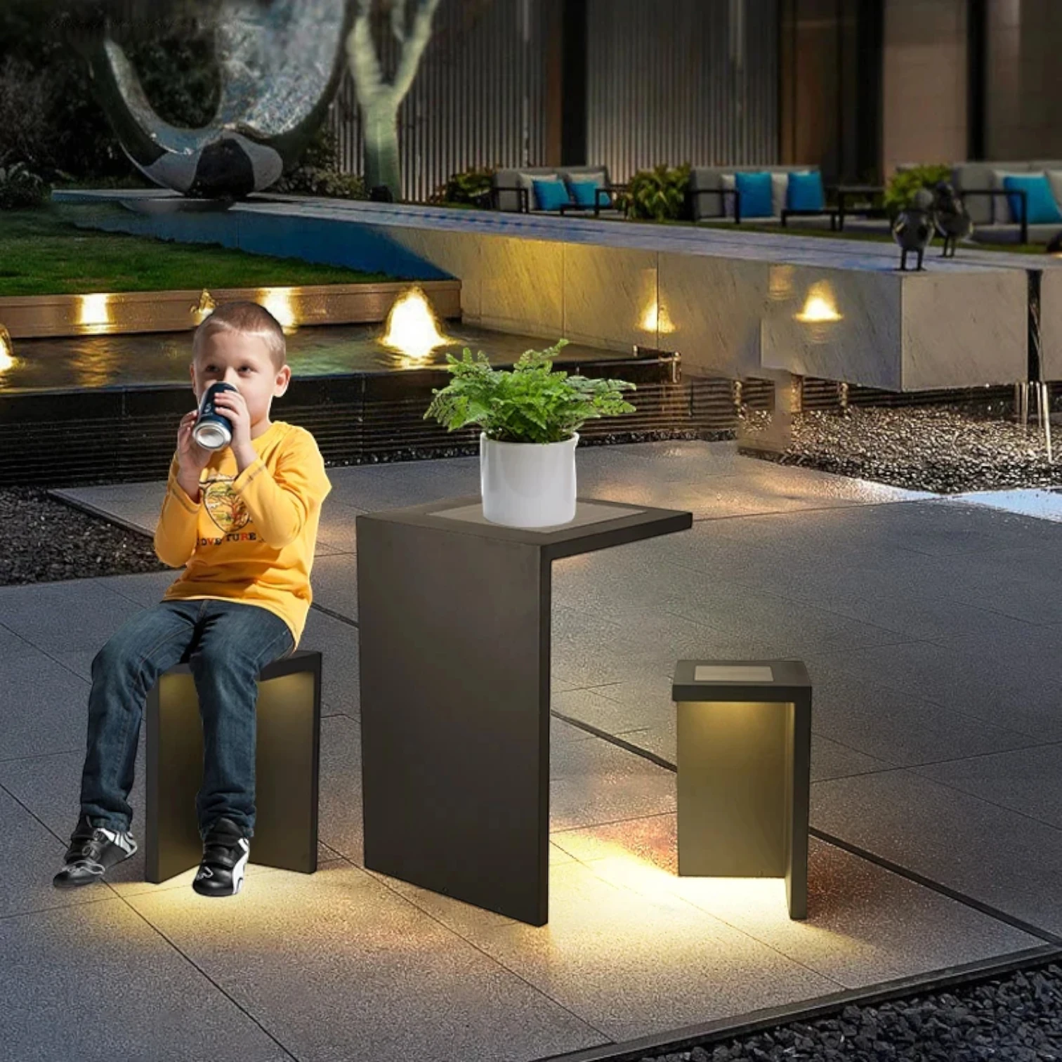 Ce Mobilier Lumineux Solaire Extérieur Moderne transforme va radicalement transformer l’aménagement des terrasses et espaces verts contemporains. Grâce à leur design cubique minimaliste en acier inoxydable anthracite, ces éléments multifonctionnels redéfinissent l’art de vivre en extérieur. L’intégration de l’éclairage LED 3000K dans des formes géométriques épurées crée instantanément une ambiance chaleureuse et sophistiquée. Chaque pièce devient simultanément table fonctionnelle, assise confortable et point lumineux architectural, optimisant l’utilisation de l’espace tout en apportant une touche design remarquable.