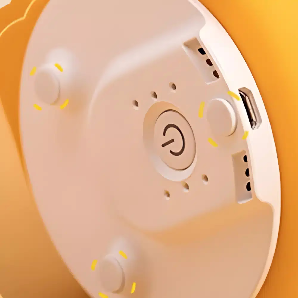 Un bouton à pression situé juste en dessous de la lampe sert d’interrupteur, mais fait aussi office de commutateur parmi ces positions. Vous aurez une petite lampe rechargeable avec vous pour vous éclairez, tout en préservant un environnement favorisant l’endormissement. Notre veilleuse Tigoo accompagnera enfants et parents pour le biberon, le change, et même en cas de réveil nocturne.